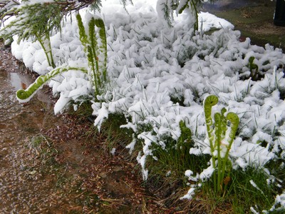 The poor trees... had to get in there and shake the wet snow off so they would not snap in half... and the sufferin' fiddleheads... -5 tonight too !