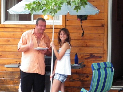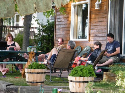 Russ and his brother enjoying dinner on the dock at sunset time...