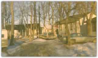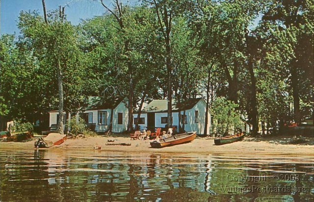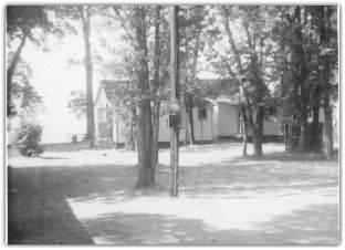 View from road to lake (1970's). Cottages by the water were later replaced, but #4 to the right still stands.